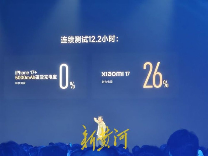 续航成为雷军重点突破的对比维度。他宣布小米17标准版搭载7000毫安电池,近乎“iPhone17的2倍”,并现场展示对比测试结果:“和iPhone17挂一个5000毫安时的充电宝比,当它们完全没电以后,我们还有26%……小米17不仅击败了iPhone17,在实战中也击败了iPhone17系列全部机器。”